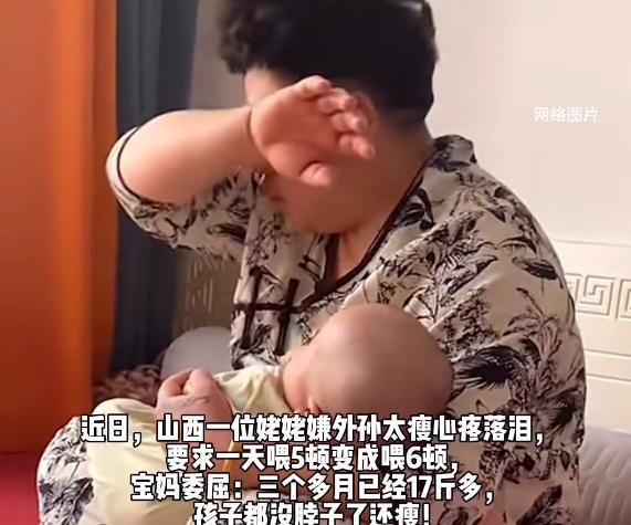 一位姥姥因为心疼外孙看起来瘦弱,坚持要求一天从喂5顿增加到喂6顿,而宝妈则对孩子的体重增长表示担忧,认为孩子已经超重,不应再增加喂养量。