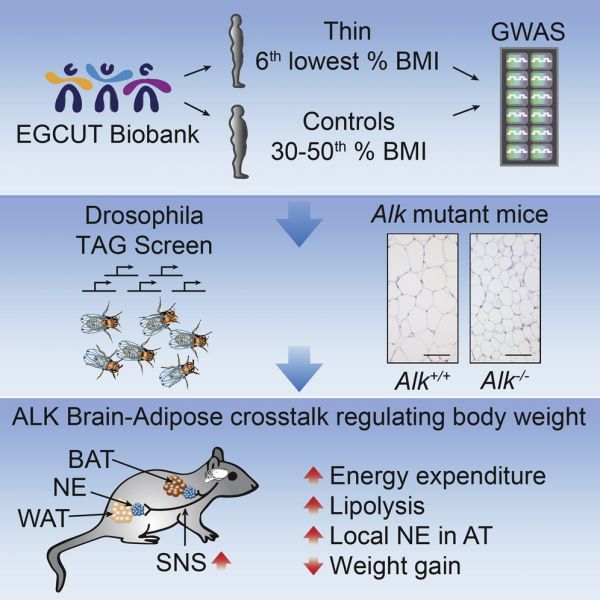研究人员通过对果蝇和小鼠的一系列研究,研究了ALK与苗条之间的关系。当研究小组在果蝇和小鼠中敲除ALK基因时,两者都对饮食引起的肥胖症具有抵抗力。在遗传性肥胖小鼠模型中,ALK缺乏还与体重增加减少有关。即使ALK基因敲除小鼠的饮食和活动水平与正常小鼠相同,它们从幼年起仍然表现出较低的体重和体脂,这种脂肪和脂肪一直持续到成年。