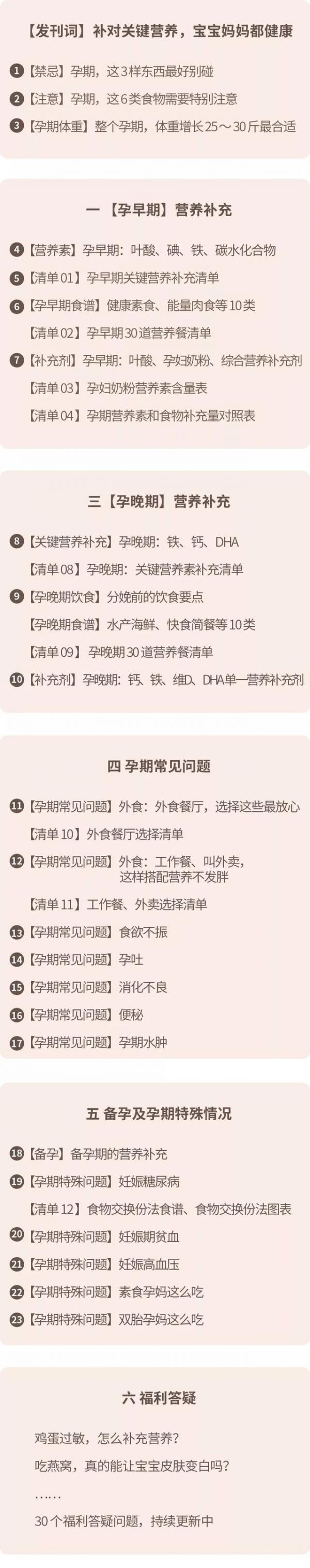 不仅包含孕妈妈需要的各种营养知识,还分孕早期、中期和晚期为大家定制了30 套菜谱、10 大主题菜式,每天跟着课程吃,轻松长胎不长肉。