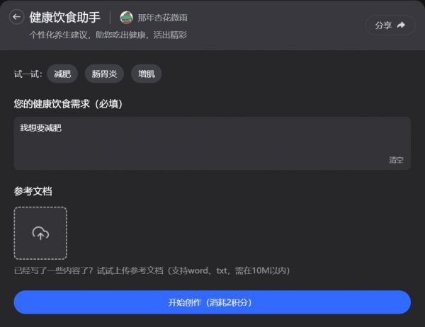 减肥怎么吃瘦得快?肠胃不好如何食补调理?想快速增肌应该怎么制定饮食计划?别花冤枉钱找人咨询了!AI健康饮食助手来帮你少走弯路!