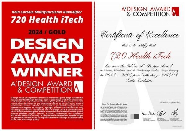 近日,720健康科技旗下的两款智能空气环境产品——华为智选 720智能空气净化加湿一体机与华为智选 720 智能空气净化除湿一体机,在意大利 A' Design Award 国际工业设计大奖赛中脱颖而出,分别斩获金奖(Top 1%)与银奖(Top 3-5%)。这一成绩不仅印证了720健康科技在工业设计与技术创新上的双重突破,更标志着中国品牌在全球健康家电领域的引领地位。