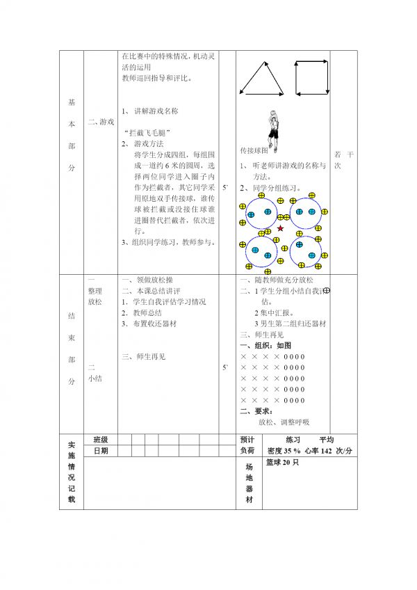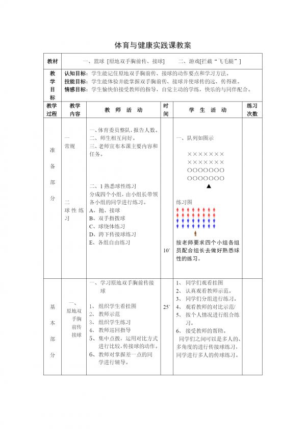 体育与健康实践课教案 教材一、篮球[原地双手胸前传、接球]二、游戏[拦截“飞毛腿”]教 学 目 标认知目标:学生能记住原地双手胸前传、接球的动作要点和学习方法。 技能目标:学生能体验并能掌握双手胸前传、接球并使球传的远、传得准。 情感目标:学生愉快伯接受教师的指导,自觉主动的学练,快乐的与同伴配合。教学 过程教学 内容教师活动时 间学生活动练习次数准 备 部 分 一 常规 二 球性练习 一、体育委员整队,报告人数。 二、师生相互问好。 三、老师宣布本课主要内容和任务。 二、1熟悉球性练习 分成四个小组,由小组长带领各小组的同学进行练习。 A、抛、接球 B、双手指拨球 C、球绕体练习 D、跨下传接球练习 E、各组自由练习 10` 队列如图示 ××××××× ××××××× 〇〇〇〇〇〇〇 〇〇〇〇〇〇〇 ▲ 练习图 按老师要求四个小组各组员配合组长去做好熟悉球性的练习。 基 本 部 分 一、 原地双手胸前传接球 学习原地双手胸前传接球 组织学生看挂图 教师示范 组织学生练习 教师巡回指导 集中点拨,运用对比方式进行比较,传接球的动作。 教师对掌握差一点的同学进行辅导。 25`同学们观看挂图 认真观看教师示范。 同学们分组进行练习。 观看教师的对比示范/ 按个人情况进行组合练习。 接受教师的帮助。 同学们之间可以是多人的、多角度的进行传接球练习,同学进行多人的传球练习。 基 本 部 分 二、游戏 在比赛中的特殊情况,机动灵活的运用 教师巡回指导和评比。 讲解游戏名称 “拦截飞毛腿” 游戏方法 将学生分成四组,每组围成一道约6米的圆周,选择两位同学进入圈子内作为拦截者,其它同学采用原地双手传接球,谁传球被拦截或没接住球谁进圈替代拦截者,依次进行。 3、组织同学练习,教师参与。 5` 传接球图 听老师讲游戏的名称与方法。 同学分组练习。 若干次 结 束 部 分 一 整理 放松 二 小结 一、领做放松操 二、本课总结讲评 1.学生自我评估学习情况 2.教师总结 3.布置收还器材 三、师生再见 5`一、随教师做充分放松 二、1学生分组小结自我评估。 2集中汇报。 3男生第二组归还器材 三、师生再见 一、组织:如图 ××××0000 ××××0000 ××××0000 ××××0000 ××××0000 二、要求: 放松、调整呼吸实 施 情 况 记 载班级预计 负荷练习平均 密度35%心率142次/分日期场 地 器 材篮球20只