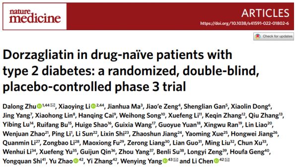 多格列艾汀两项Ⅲ期临床研究——SEED(播种研究)[1]和DAWN(黎明研究)[2]结果同时于国际顶级医学期刊Nature Medicine(IF=53.44)重磅发布。这也是GKA类药物第一次在国际顶级医学刊物发表Ⅲ期研究结果。其中,SEED研究由南京大学医学院附属鼓楼医院内分泌科主任兼大内科主任朱大龙教授牵头;DAWN研究由中日友好医院杨文英教授牵头。Nature Medicine是Nature旗下专注生物医学领域的学术期刊,重点关注“展示新颖疾病过程的机理,有直接证据的生理相关的研究结果”的原创论文。近年来开始专注发表大型临床研究论文,Nature Medicine的影响因子持续上升,近2年影响因子为53.44,与新英格兰医学杂志NEJM、柳叶刀Lancet、美国医学会杂志JAMA、英国医学杂志BMJ共同跻身国际五大顶级医学杂志之列。作为由中国创新药企业与中国研究者携手研发,全球首个以修复血糖传感器-葡萄糖激酶(GK),重塑血糖稳态为目标的糖尿病治疗新药,多格列艾汀无论是单药还是联合二甲双胍用药的Ⅲ期研究,都具有划时代的意义,为糖尿病治疗开启新篇章。