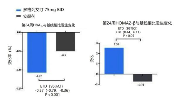 图1:多格列艾汀单药效果研究HOMA2-β:胰岛β细胞稳态模型评估[2],是用新的稳态模型评估胰腺β细胞功能的指标ETD(95%CI):估计治疗差异和相应的95%置信区间BID:一天两次;HbA1c:糖化血红蛋白