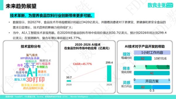 数据显示,到2027年,全球食品技术市场规模预计将超过3420亿美元,随着消费者对低成本、健康和安全食品需求不断上升,技术趋势的影响力将进一步扩大。其中,AI人工智能技术尤为突出。2020年,AI在食品饮料市场的应用价值已达30.7亿美元,预计到2026年将攀升至299.4亿美元。AI技术在产品开发过程中可实现降本增效,提供创新灵感,助力产品创新。