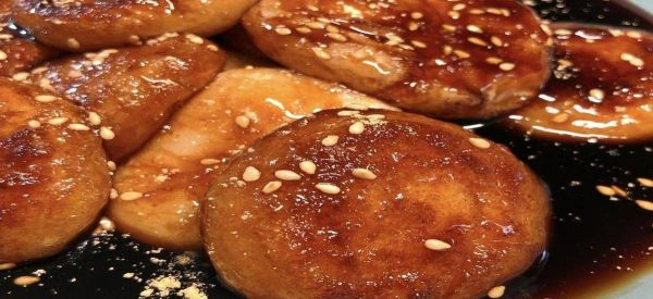 随后使用平底锅小火加热,放一点点植物油。等油温热时,将成型的年糕放进去煎上色,等待两面煎至金黄后取出装盘