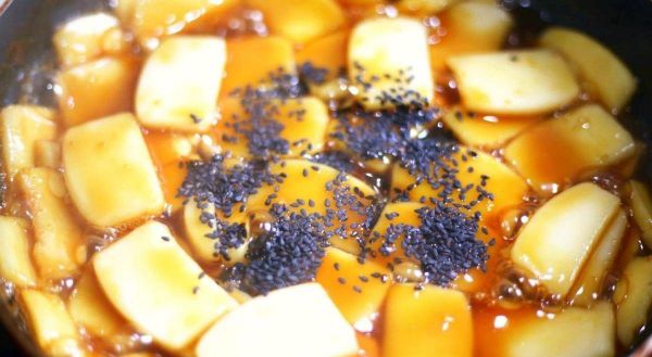 最后使用余下20克红糖加水煮至浓稠,将红糖汁淋在年糕上即可。