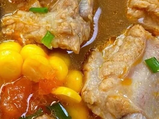 3、起锅烧油,油热后放入番茄翻炒,炒出汁水后,放入排骨翻炒均匀,然后放入适量清水和玉米,盖上盖子炖煮四十分钟。