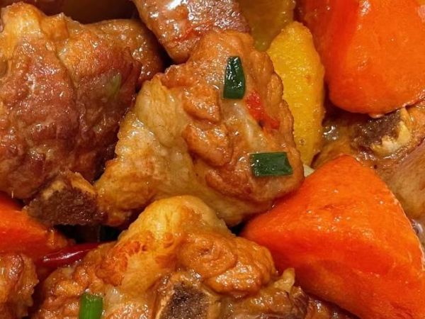 6、时间到,再放入胡萝卜和土豆,继续炖煮十分钟。煮好后,开大火翻炒收汁,撒上葱花点缀,即可出锅装盘开吃。