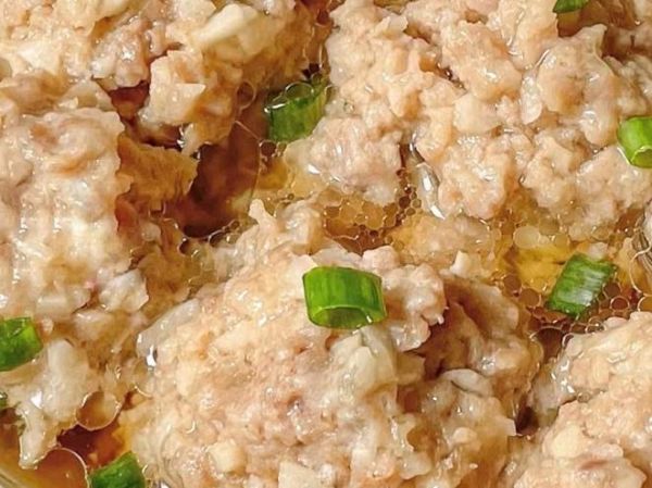 4、山药肉泥蒸熟后,取出来撒上葱花点缀,即可端上桌开吃。