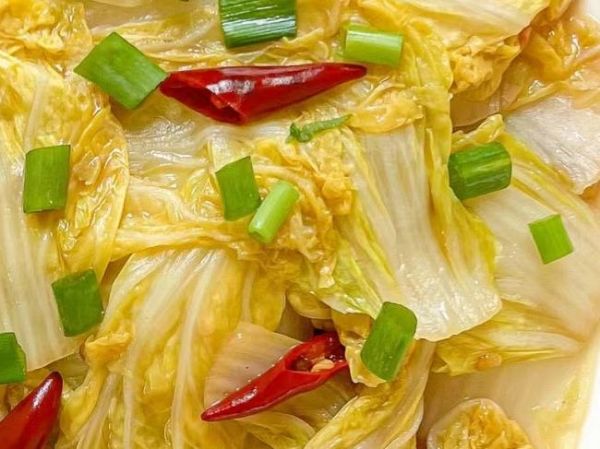 3、娃娃菜炒软后,加入生抽、蚝油、醋调味,翻炒均匀炒至入味,炒熟后撒上葱花点缀,即可出锅装盘开吃。