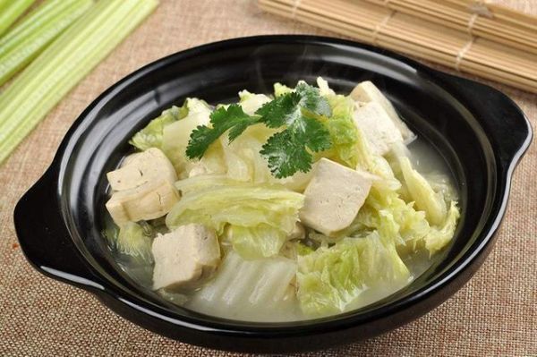 【做法】:将大白菜切成小段备用,老豆腐切成块状备用,锅中加油烧热,加入肉末炒散,加入葱姜蒜末炒香,加入适量清水烧开,加入老豆腐煮至入味,加入大白菜煮至变软,加入盐、鸡精和胡椒粉调味即可。