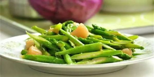 锅内倒香油烧热,放入葱花爆香,先放入干贝、芦笋拌炒,再放入文蛤用大火略炒,加盐即可。