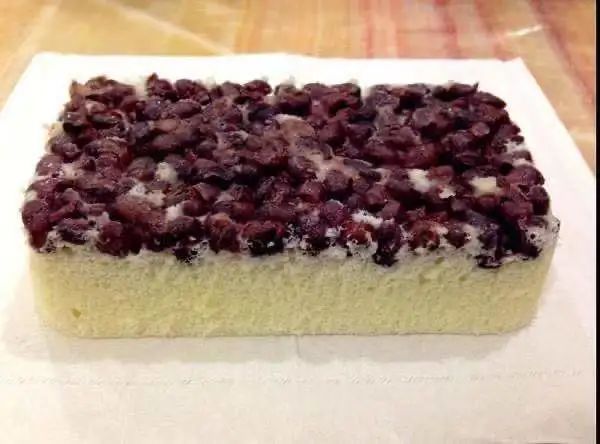 将模具均匀刷上薄薄一层油。铺上一层蜜红豆,备用。