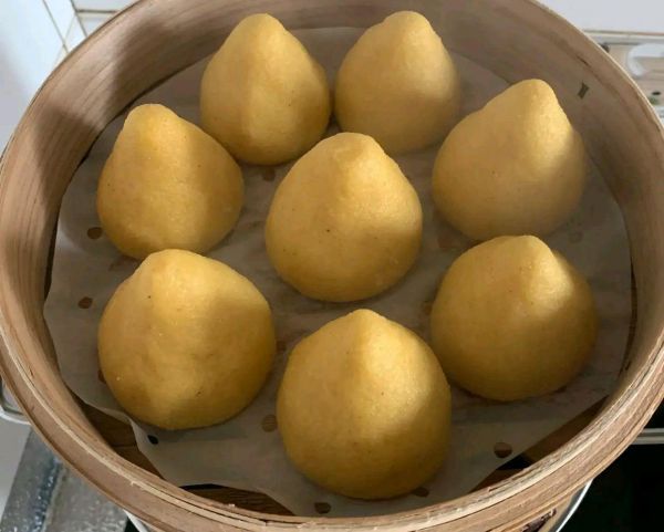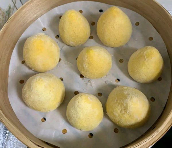 3.窝窝头做好后,上锅蒸时将有洞口的一面朝下放置,这样受热会更均匀,蒸的时候容易熟透。蒸30分钟,根据个头大小调整,蒸熟闷5分钟。