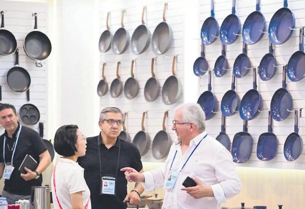 在第137届广交会上,境外采购商在厨具展区洽谈。