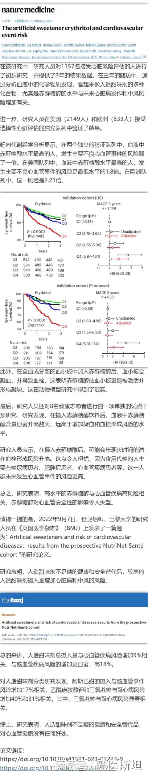2023年2月27日,美国克利夫兰医学中心的研究人员在国际著名期刊“Nature Medicine”上发表了一篇题为“The artificial sweetener erythritol and cardiovascular event risk”的研究论文。