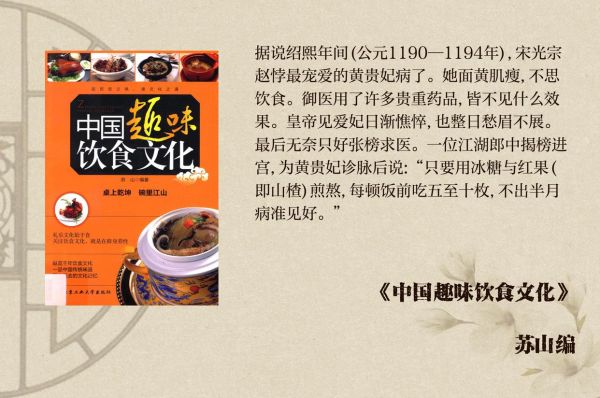 糖葫芦的历史可以追溯到宋朝,最初是作为一种药膳出现的。据《中国趣味饮食文化》记载,宋光宗赵悖最宠爱的黄贵妃因病不思饮食,御医用了许多贵重药品皆不见效。最后,一位江湖郎中揭榜进宫,开了一个看似简单的方子:用冰糖与山楂煎熬,每顿饭前吃五至十枚。黄贵妃按此办法服用后,病果然如期痊愈了。这种山楂的做法传到民间,老百姓为了好看且便于携带,又把山楂串起来卖,就成了现在的糖葫芦。
