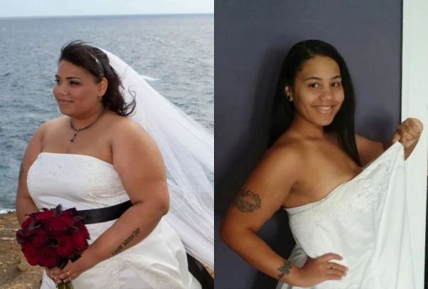 由于妹纸的不断努力坚持跑步,短时间内从280磅减到了100多磅,就连以前的婚纱都大了一圈出来: