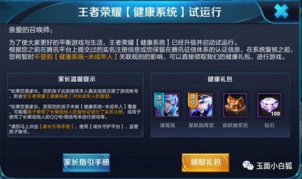 王者荣耀健康系统今日开启运行,这意味着未成年人的游戏时间将会缩短,而本次试运行也给大家带来了福利,那就是免费领取健康礼包。