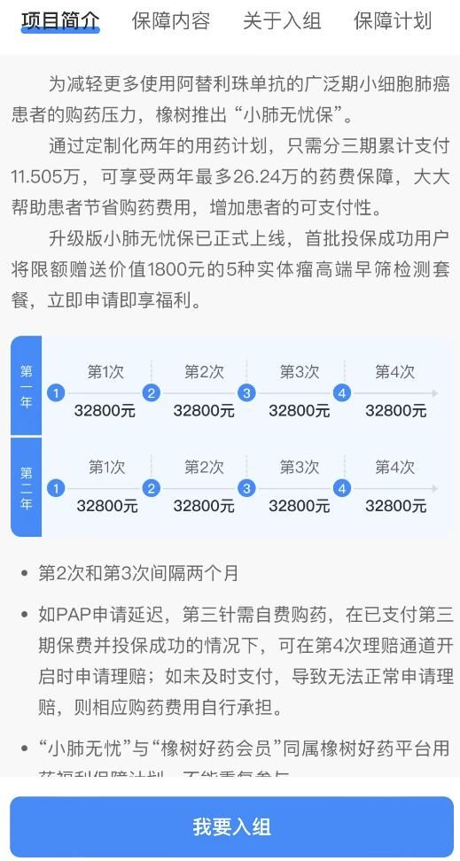再以一款“小肺无忧保”产品为例,其通过定制化两年的用药计划,只需分三期支付,可节省最多26.24万的药费保障。