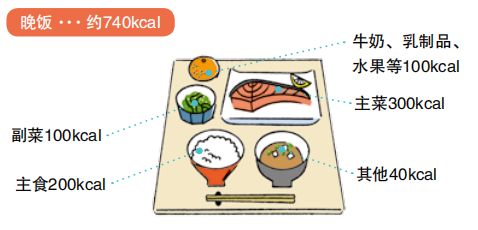 知道每日必需的能量值后,就可以掌握每一餐摄取的总的能量值,以及每种食物中所含的能量值。若摄取过多,可以通过控制下一餐的能量值来进行调节。早饭···约650kcal / 午饭···约700kcal