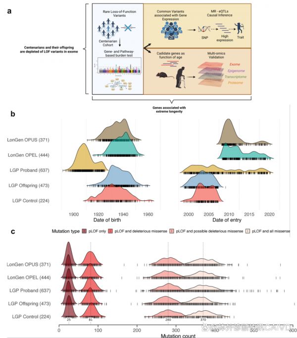 该研究中的全外显子组数据来自长寿基因项目(LGP)和LonGenity长寿基因研究队列中的德系犹太人(阿什肯纳兹犹太人),共包含637名百岁老人、917名百岁老人后代和595名对照个体。被招募的百岁老人大多出生于1900-1920年;而大多数后代和对照组出生于1920-1960年。