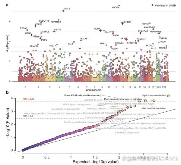 为确定百岁老人中突变负荷较低的特定基因和通路,研究团队进行了基因水平和通路水平的负荷检测。结果显示,基因水平分析确定了35个达到显著性水平(FDR < 0.05)的低突变负荷基因,其中14个基因在UKB一项独立研究中通过亲代寿命相关性状得到验证。