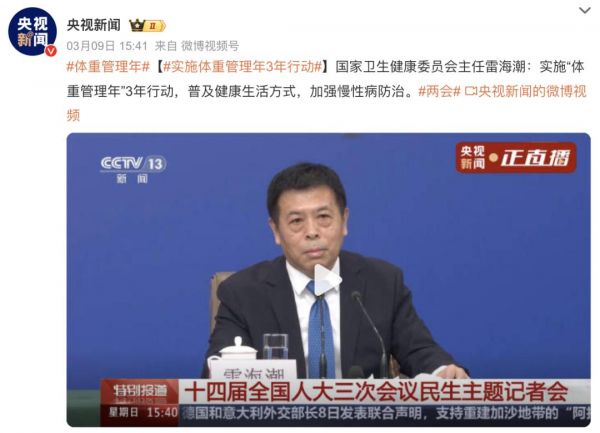 雷海潮主任在3月9日举行的十四届全国人大三次会议民生主题记者会上表示:“有些人腰围太大,体重超重,甚至患上了慢性病……这就需要专业医生和专业医疗机构的帮助。”