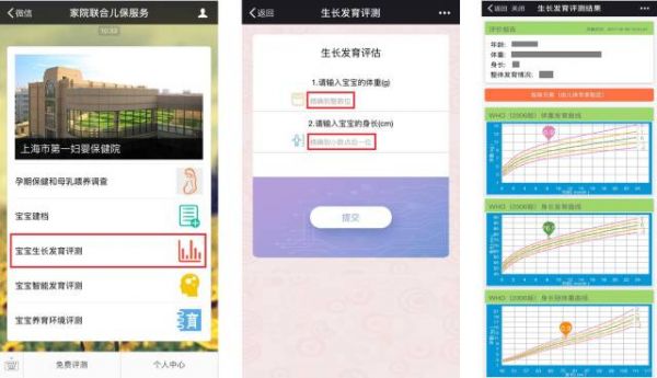 家院联合儿保服务号提供的生长发育循证保健系统采用WHO(2006版)常模标准,评价婴幼儿体格发育状况,并提供以“结果”为依据的、针对各月龄的喂养指导。同时记录下宝宝各阶段体格、智能的成长轨迹,可作为就诊时医生进行精准保健的依据。
