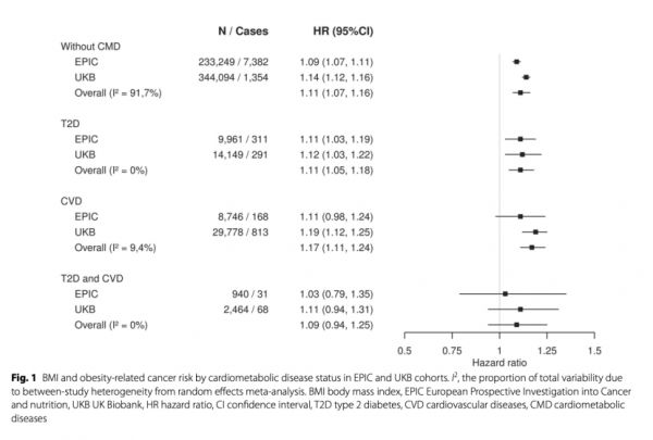图|在 EPIC 和 UKB 队列中,通过心血管代谢疾病状况研究的 BMI 和与肥胖相关的癌症风险(来源:该论文)