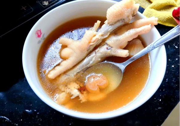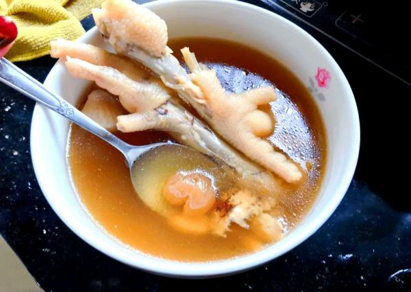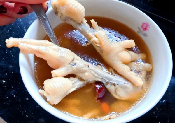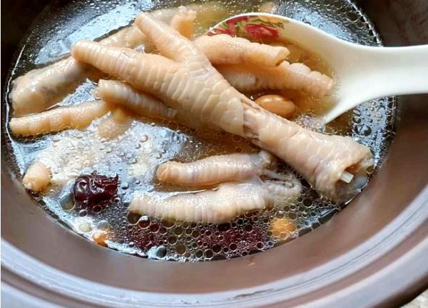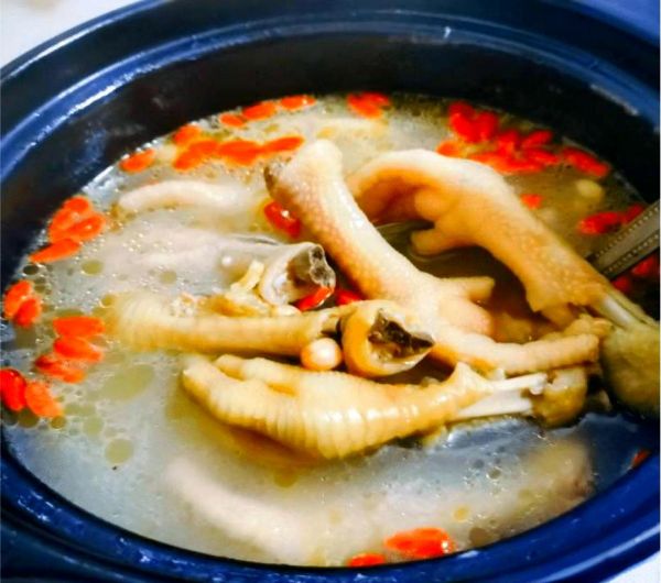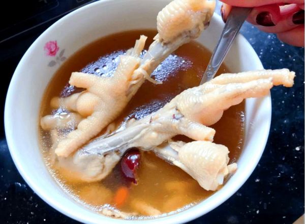 炖煮一段时间后,需适时舀去浮沫,并观察食材的软烂程度。待鸡爪充分吸收汤汁,且花生和红枣煮至绵烂时,撒上枸杞子增香,加入食盐、味极鲜和香油调味。最后,用葱花装点,香气四溢的红枣花生鸡爪汤就完成了。