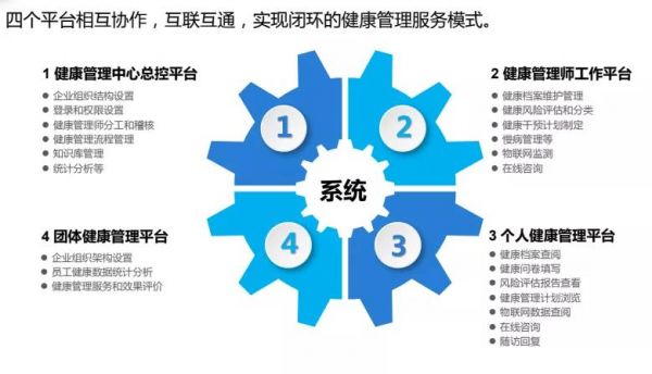 健康管理系统由四个平台组成︰健康管理中心总控平台,健康管理师工作平台,个人健康管理平台,团体健康管理平台。四个平台相互协作,互联互通,达成闭环的健康管理服务模式。