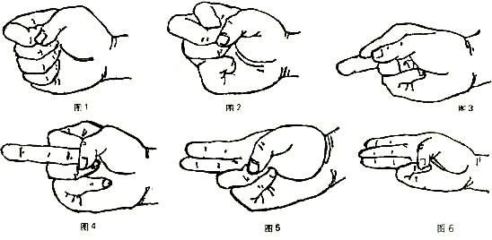 三指点穴:此法运用拇、食、中三指,同样微屈掌指与指间关节。拇指腹紧抵食、中指末节,无名、小指握紧,而拇食、中指指端则对准穴位进行施力。