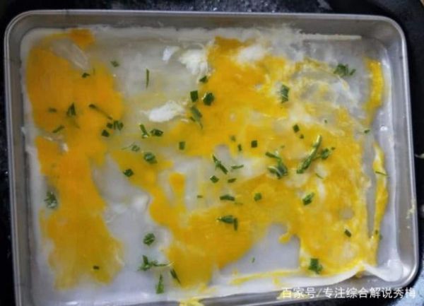 具体步骤:先将瘦肉切成肉末,加料酒和生抽腌制一下,大概十分钟就可以了。再将鸡蛋打散在碗内,搅拌均匀,香葱切成香葱末。准备好配料以后我们就可以开始制作肠粉了。将粘米粉、澄粉和黄米粉加水调制成浆状,然后在不锈钢的盆子上用刷子刷上一层油,再撒上一点猪肉末平铺在上面,再用勺子舀一勺粉浆,晃动不锈钢盘子使粉浆均匀分布,最后淋上一点鸡蛋和葱花。