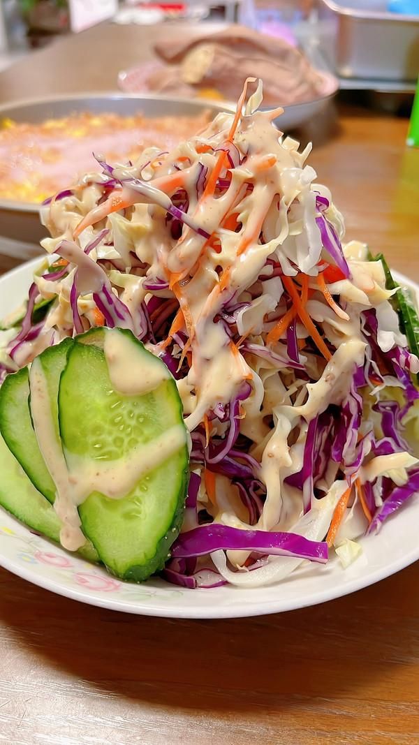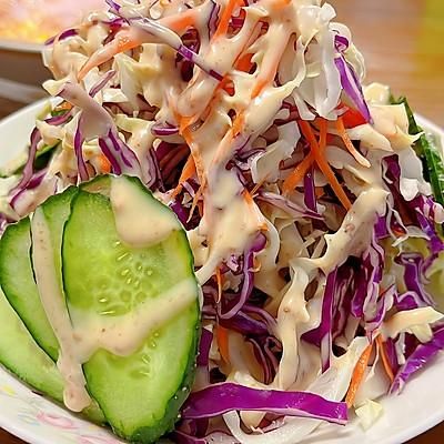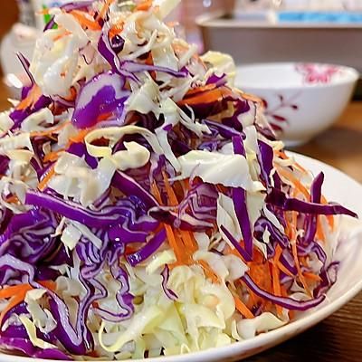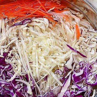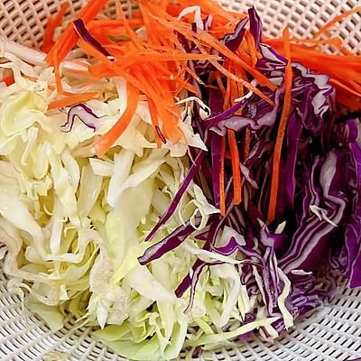 1、卷心菜、紫甘蓝、胡萝卜洗净切丝