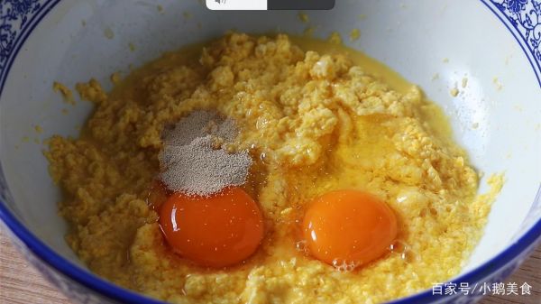 2、再加入2个鸡蛋、3g酵母,搅拌至充分溶解,如果喜欢口感甜一点、直接当零食吃,可以根据个人口味加入适量白糖,不加白糖口感是非常淡的玉米清甜味,可以直接吃也可以就菜吃。