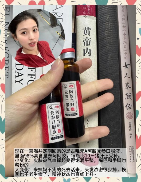 养气血:以前总觉得韩国的补剂都是智商税,但坚持喝了一段时间后,脸色红润饱满有光泽,身体小毛病都没了。现在一直喝的是这款补气血的口服液,里面含有高浓度的补气血成分,让气血源源不断充盈到皮肤头发,还有党参、地黄、当归辅助气血运转,360度滋养全身细胞。小变化:皮肤被气血撑起变得饱满平整,嘴巴和手脚也粉粉的。大变化:来姨妈不疼的死去活来,头发浓密很少掉,换季也不老生病了,精神状态也直线上升~