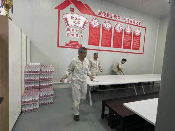 公司在二月份的时候在原有的基础上进行了一定的改造,是定制化的集装箱,增设了一些家用电器,像冰箱、微波炉、热水器,还设了简易的淋浴房、洗衣机,生活设施都是具备齐全的。在原有基础上提高了职工的休息环境,让他们能够更好地在中午休息。