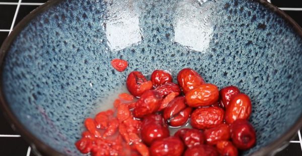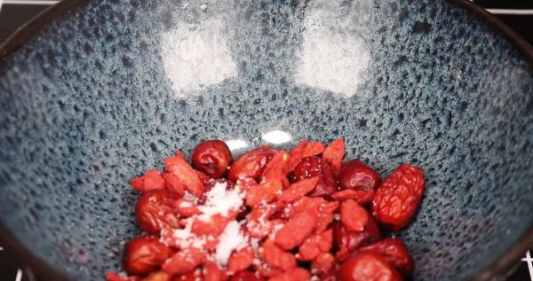 4、准备一个大碗,向碗中加入咱们准备好的红枣和枸杞,然后放上适量的食用盐和面粉,倒入清水清洗一遍,前面也提到过了,食用盐可以杀菌消毒,而面粉能够吸附红枣和枸杞表面的脏东西,使它们变得更加干净,清洗完之后咱们把水倒掉,然后再倒入适量的清水冲洗一遍。