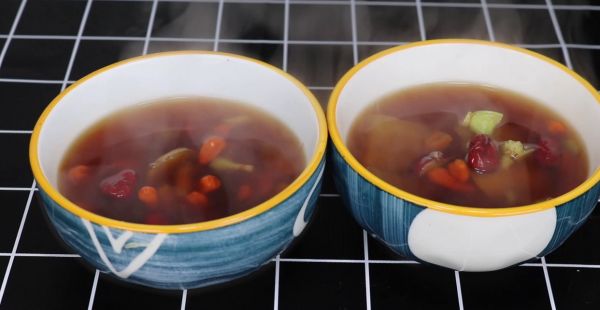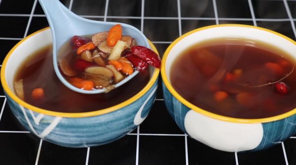 6、接下来咱们在锅中加入适量的清水,用大火将其烧开,水开之后加入所有食材不停地搅动,一直煮到水开之后加入20克红糖,煮至红糖颜色红亮,三分钟之后就可以关火装入碗中了,一道特别美味的香菜枸杞红枣养生汤就这样完成了。