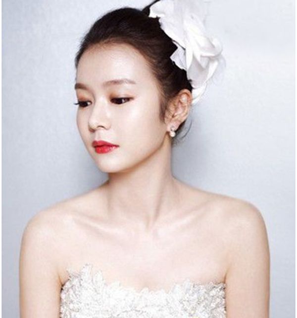 干净的没有一丝杂发的韩式丸子头,搭配素雅的花朵头饰就足够惊艳了,装饰一点不会抢到新娘自身的风头,这漂亮的五官才是重头戏,新娘就尽情的用美貌来征服众人吧!