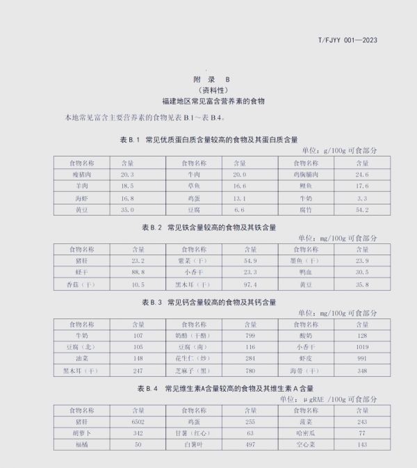 在食材选择上,《标准》充分考虑了福建居民的饮食习惯和地域特色。例如,精选了富含主要营养素的食材如笋、鲤鱼、草鱼、海虾等,并建议每周至少安排两次鱼和各种水产品的摄入。同时,肉类食物以水产类为优先选择,禽类、畜肉则以瘦肉为主。动物内脏食物每月食用2至3次即可。