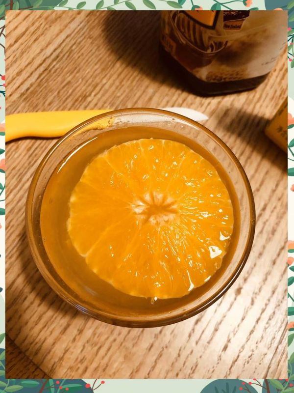 2、接着,加入一勺蜂蜜和半勺柠檬汁,若家中无现成的柠檬汁,可用两片柠檬替代。之后,将橘子片放入微波炉,选择高火模式加热两分钟。请注意,高火是关键,且加热时间务必控制在两分钟以内。