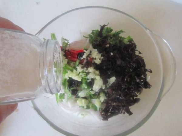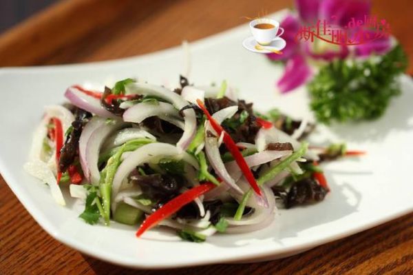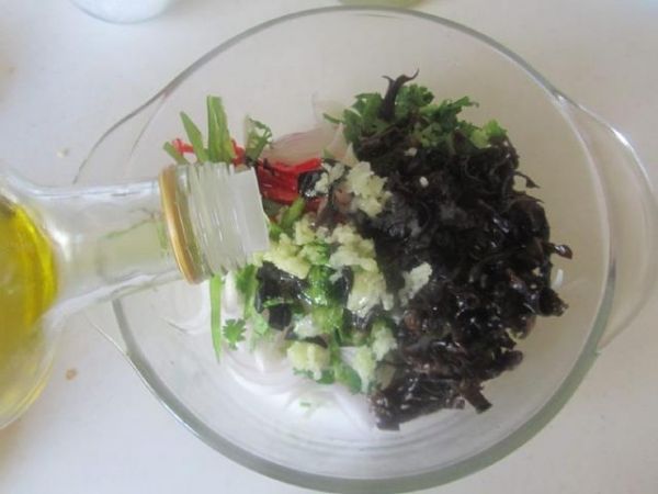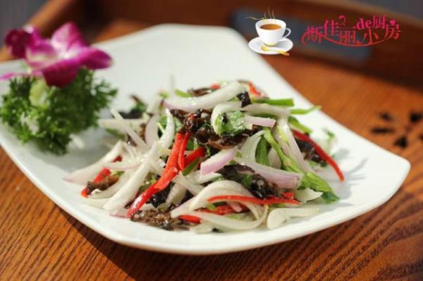 洋葱 适量、黑木耳 适量、青红椒 适量、香菜 适量、蒜 适量、白醋 适量、橄榄油 适量、精盐 适量
