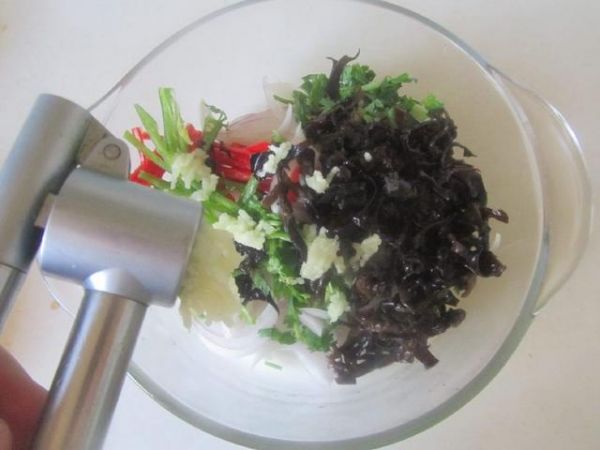 4.将所有材料都切成细丝放入碗中, 将蒜按压成泥;