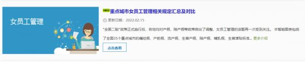 该智能图表包括了全国35个重点城市的痛经假、产前假、流产假、生育产假、陪产假、哺乳假、生育津贴标准等与女员工管理相关的热点话题,并就具体话题的法律依据及专业解读做了列表呈现。您可根据查询需要,定位目标城市后选择具体话题进行快速查找及自由对比。