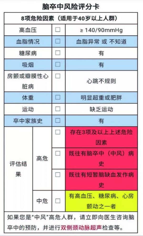 在进行风险评估前,先来看一个示例:43岁的职工张某,身材有些发福,不爱好体育锻炼,除了血压145/95mmHg,没有其他疾病,家里去世的父亲曾患有脑出血。要按一般常识,张某身体基本健康,然而,通过脑卒中的风险评估,却发现他是脑卒中风险高危人群的一员。评分标准中有八个项目:血压>140/90mmHg、心房颤动、吸烟、胆固醇>240mg/d、糖尿病、很少进行体育活动、明显超重或肥胖(BMI≥26kg/m2)、有脑卒中家族史,每个项目1分,≥3分即是高危。按照这份简单的评分标准进行评价时,很容易发现自己或亲人被列为脑卒中的高危人群。不过人们也不必恐慌,评估是为了提高对脑卒中的认识,脑卒中不可控的危险因素有年龄增长和遗传等,但是更多的可控因素可以通过调节生活方式进行控制,遥控器掌握在我们的手上。