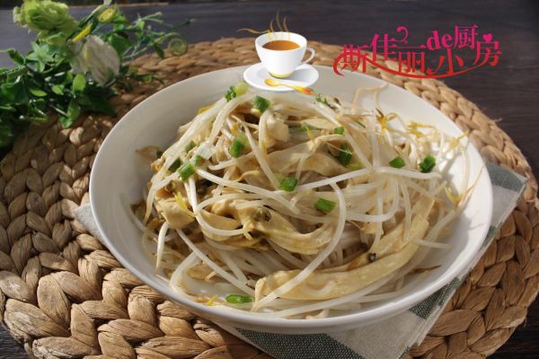 制作:烧锅开水加入1小勺盐,将千张丝放进锅中焯煮两分钟后捞出备用。 热锅凉油,加入少许蒜末进锅煸炒香,再将焯好的千张丝放进锅中翻炒两下,加入洗净的绿豆芽进锅翻炒至微微软,再加入适量的盐调味翻炒均匀,盛入盘中加入少许葱花即可。