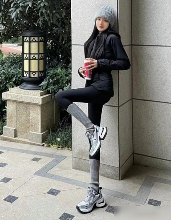 对于突出时尚感来说,最重要的是要有层次感,这样的搭配既可以塑形,又可以展示出层次感,“袜子裹瑜伽裤”这种搭配就是为了突出层次感,在叠加区内,通过厚薄的不同营造出层次感。